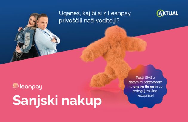 Od nedelje, 2.11. do četrtka, 6.11., bodo voditelji Aktuala vsak dan povedali tri predmete, ki bi jih kupili z Leanpay, a le eden od teh treh je tisti pravi sanjski nakup, ki so ga res izbrali. Vaša naloga bo, da ugibate, kateri je pravi predmet za tisti dan in nam odgovor pošljete preko SMS sporočila na številko 051 70 80 90. Poleg odgovora nam zaupajte še svoje ime in kraj bivanja, mi pa bomo od nedelje do četrtka izmed vseh pravilnih odgovorov vsak dan izžrebali dva poslušalca, ki prejmeta 2 vstopnici za ogled filma v kinematografih Cineplexx.